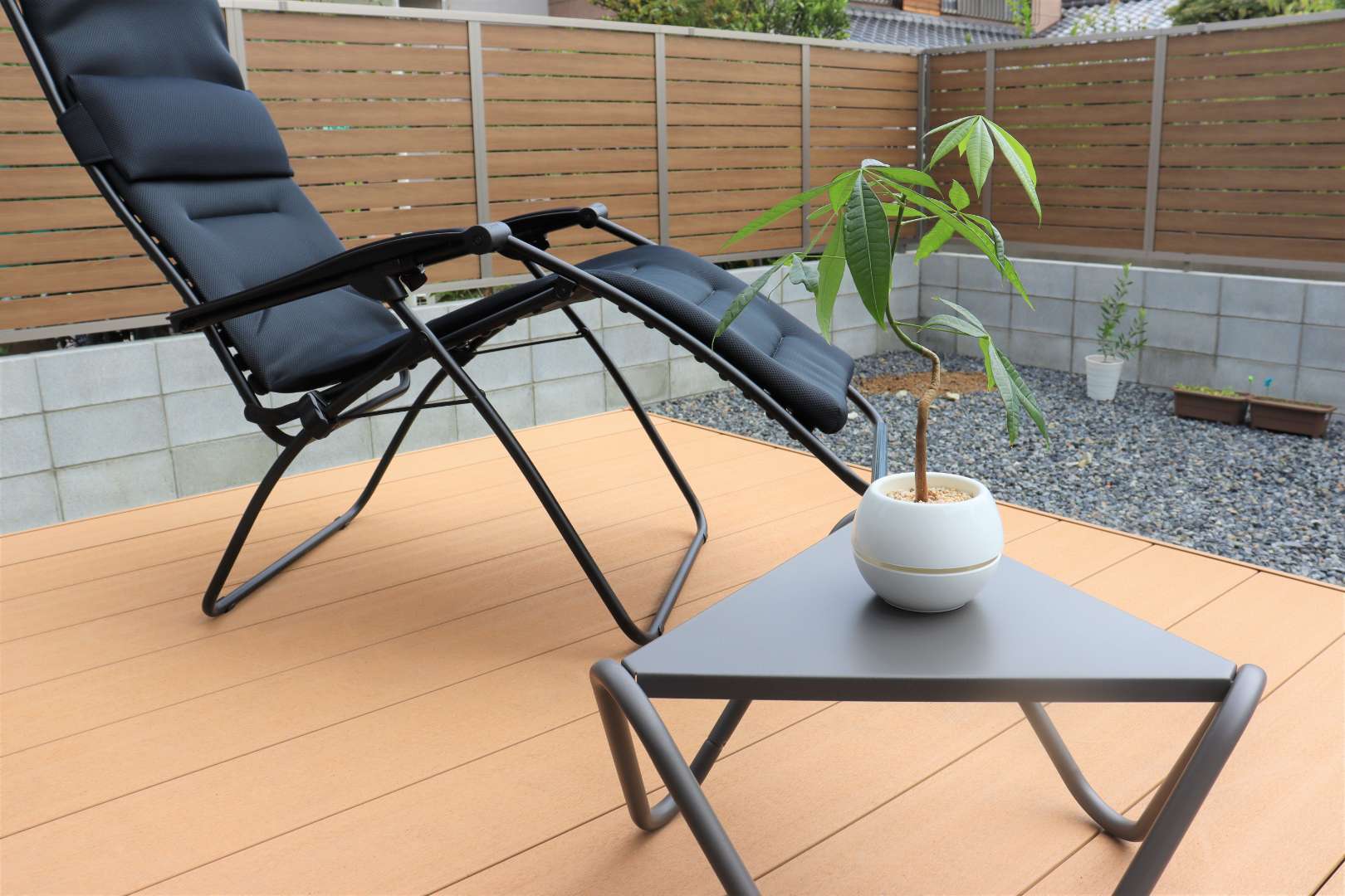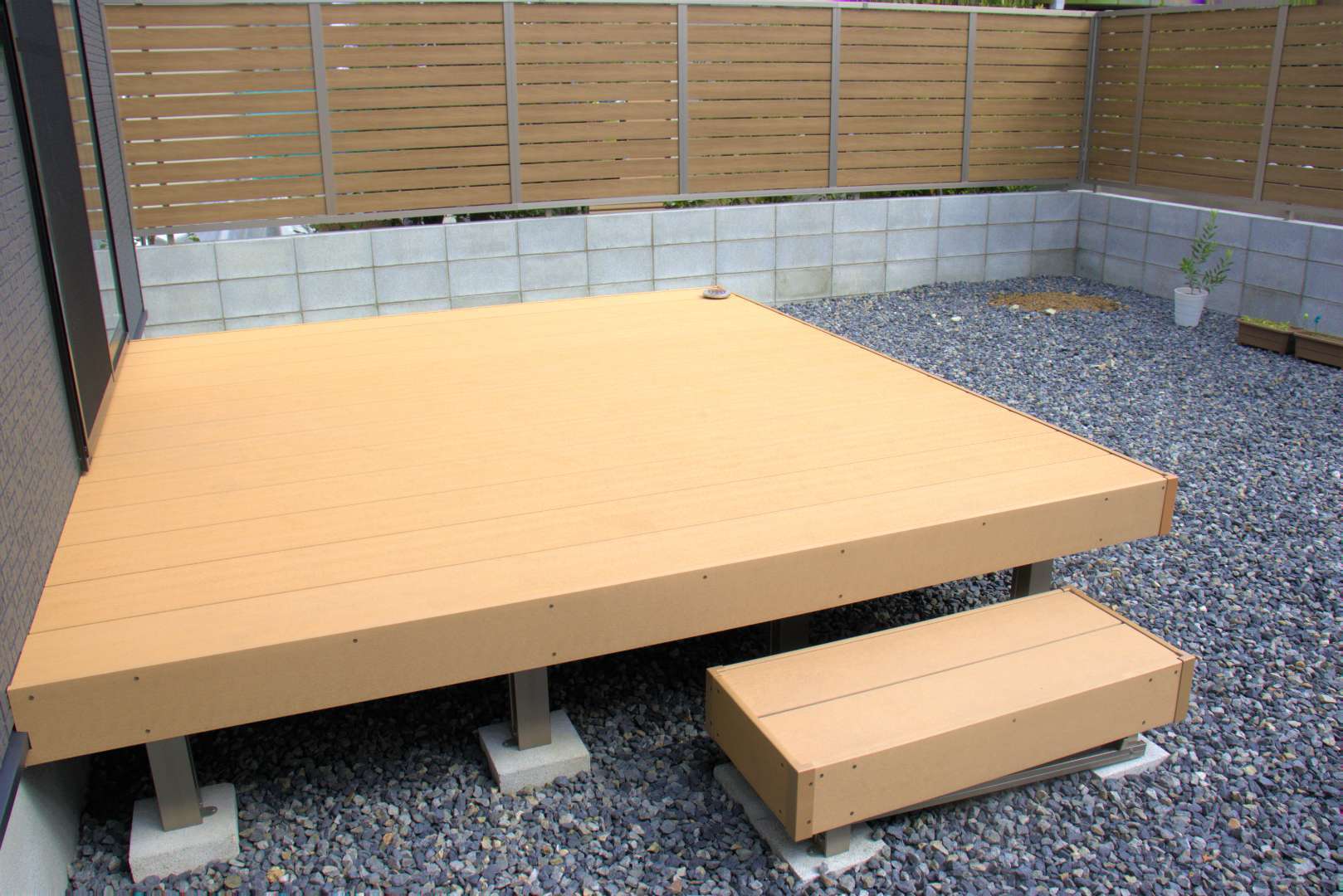 こちらのウッドデッキはLIXILさんのレストステージに独立ステップを設置した製品です。本体カラーはクリエラスクA